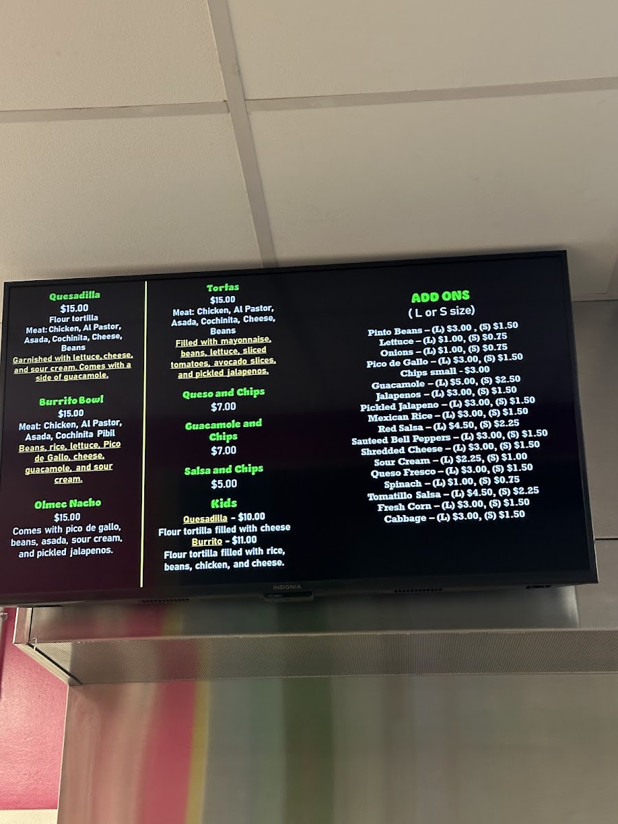 Green tomatillo salsa. Three handmade corn tortillas filled with cheese. Topped with organic onions, organic lettuce, chicken, and sour cream. Served with Mexican rice and organic beans.